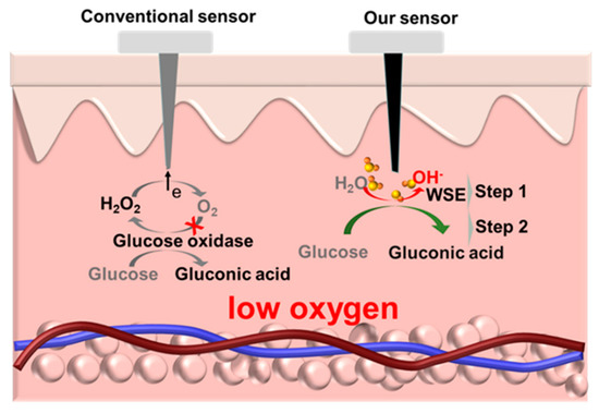 To date, the most popular detection reaction for the CGM system is glucose oxidation by oxygen that is catalyzed by glucose-oxidase (GOx) due to its compatibility with long-time glucose monitoring [2,7]. Therefore, the CGM detection relies on dissolved oxygen in interstitial fluid (ISF) as the electron-transfer mediator to bring electrons from oxidase to electrode [2,8]. This kind of oxygen-dependent sensor may lead to biased results due to the fluctuation of oxygen in tissues. Specifically, under hypoxic circumstances caused by various pathological mechanisms, the application of conventional CGM can be highly constrained.