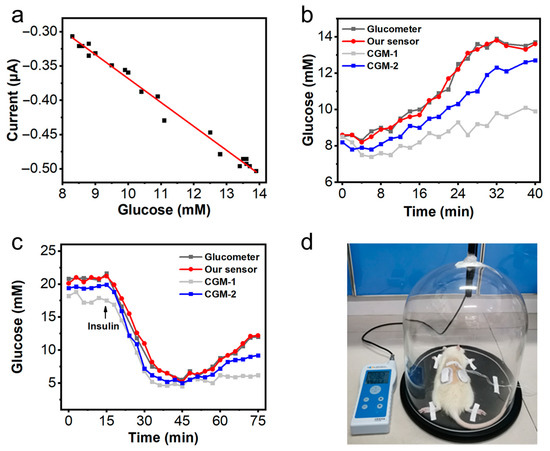 (a) A plot of the current measured from our sensor versus the blood glucose levels from glucometer. (b,c) Glucose values measured using our nonenzymatic sensor versus glucose values measured by the glucometer, CGM-1, and CGM-2 in systemic hypoxic models of (b) normal rat and (c) diabetic rat. (d) A photograph of the systemic hypoxic model for CGM.