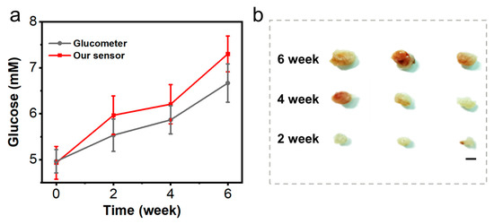 To further test the reliability of our sensor in the local hypoxic microenvironment, we established a tumor-bearing mice model. In this experiment, our sensor was used to detect the glucose levels in the ISF surrounding the hypoxic microenvironment of tumor tissue in the tumor-bearing mice, and the blood glucose level was measured by the Roche glucometer as a reference. To detect ISF glucose during tumor growth, blood glucose values were measured every 2 weeks after mice were inoculated with tumor cells. Each test included three mice and experiments were repeated three times, and subsequently executed to measure the tumor size. The relationship between the growth of mouse tumor volume and the change of blood glucose is shown in Figure 6. The changes in glucose values measured by our sensor were consistent with the changes in blood glucose using Roche glucometer. This indicated that our nonenzymatic glucose sensor can be used for blood glucose detection in a local hypoxia model. Moreover, we found that the blood glucose appeared to be positively correlated with the increase in tumors, and it probably was because of the abnormal energy metabolism during exacerbation. This data further indicated the reliability of our sensor used under a hypoxic tumor microenvironment.