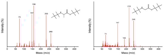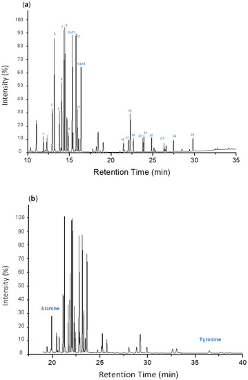 Thanks to the “short optimized” GC program, amino acids from glycine to tyrosine could be detected in less than 6 min (Figure 2) with derivatives characteristic of the native molecules [11]. In a similar manner to TMAH derivatization, DMF-DMA allowed the detection of a full fingerprint of the analysed sample, indicating the presence of amino acids.