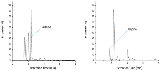 Mass fragmentograms of two compounds: alanine and glycine extracted from peak 1 at 2.87 min using specific mass fragments (m/z 158 and m/z 218, respectively).