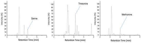 Mass fragmentograms of three compounds serine, threonine and methionine extracted from peak 7 at 4.18 min using specific mass fragments (m/z 362, 303 and 218, respectively).