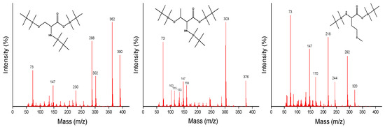 Mass spectra of coeluting derivatized serine, threonine and methionine.