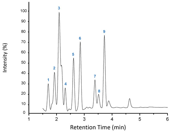 TIC of 31 amino acids derivatized using MCF-MeOH and analyzed using the “short optimized” GC-MS program. 1. Alanine, glycine; 2. β-Alanine, 2-Aminobutyric acid, 3-Aminobutyric acid, 3-Aminoisobutyric acid; 3. Proline, valine, norvaline, isoleucine, allo-isoleucine, leucine, threonine, β-Leucine, homoserine; 4. Aspartic acid; 5. Methionine; 6. Phenylalanine; 7. Lysine; 8. Histidine; 9. Tyrosine.