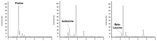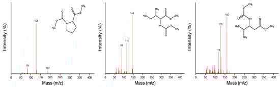 Mass spectra of derivatized proline, isoleucine and beta-leucine.