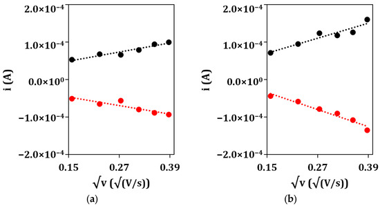 After that, the electrochemical properties of the unmodified GSPEs and nanostructured GSPEs were characterized using the CV technique in presence of a 5 mM ([Fe(CN)6]−4/−3 redox probe (an equimolar solution in 0.1 M KCl) to assess the aforementioned enhancement of the electrochemical performance of the nanostructured electrodes. The electroactive area of the developed platform was calculated by applying the Randles–Sevcik equation to the angular coefficient of the linear regression obtained by plotting the anodic (ipa) and cathodic (ipc) current peak heights vs. the square root of the scan rate (Figure 3) for the bare (a) and nanoparticle-modified (b) electrodes.