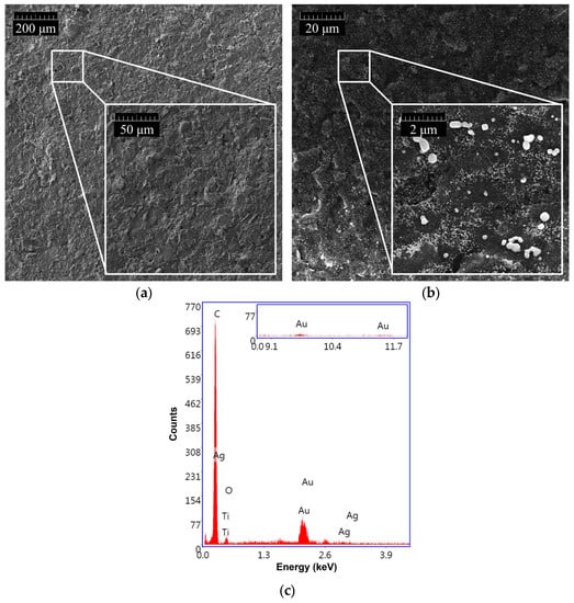 The presence of (Au&Ag)NPs with dimensions smaller than 100 nm, which are randomly distributed on the entire surface of the graphite screen-printed electrode, is visible. To assess the effective modification of the graphite surface, an EDX analysis of the nanostructured GSPEs was also carried out (Figure 4c). Three characteristic gold bands centered at 2.2, 9.7, and 11.5 keV, and two silver bands around 3.0 keV were found when the (Au&Ag)NPs-modified screen-printed electrodes were investigated, confirming the presence of gold and silver nanoparticles on the sensor surface.