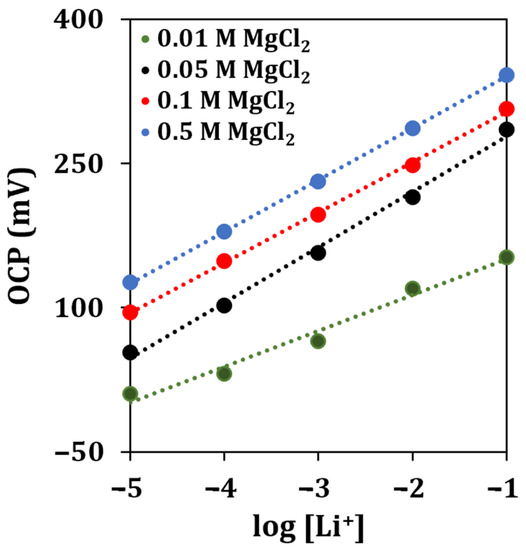 The selectivity of the developed membrane was assessed by evaluating its selectivity coefficient toward potential interfering ions, such as potassium, sodium, ammonium, and calcium ions. OCP measurements were performed in solutions at a constant activity of the interfering ion (i.e., K+, Na+, NH4+, Ca+2), aB, and varying activity of the primary ion (i.e., Li+), aA. The measured potential values are plotted vs. the logarithm of the activity of a Li+ ion. The intersection of the extrapolated linear portions of this plot indicates the value of aA that is to be used to calculate KpotA,B from the following equation: