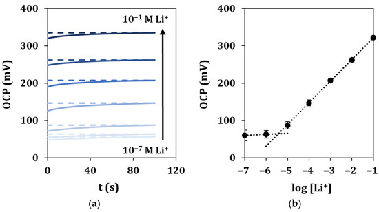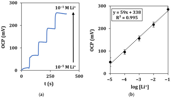 Microflow lithium detection in standard solutions. (a) Recorded OCP signals vs. time for a total duration of 500 s at a flow rate of 0.2 mL/min and (b) corresponding calibration curve. Each measurement was repeated at least 5 times using the same sensor.