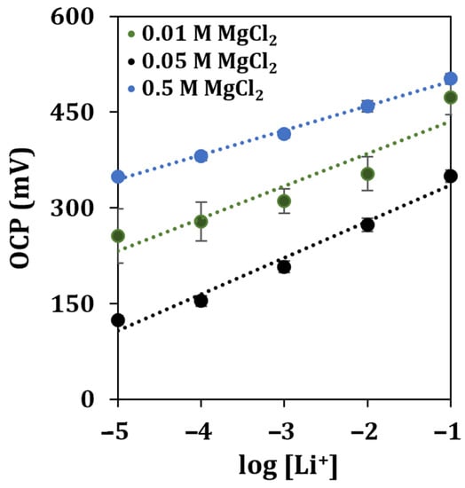 Lithium calibration curves obtained with different concentrations of the supporting electrolyte solution by OCP measurements (n = 5).