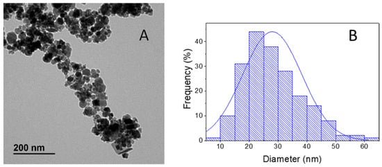 The electrochemically synthesized magnetite was characterized using different techniques. Figure 1A shows a transmission electron microscopy (TEM) micrograph where the nanoparticle size and spherical shape can be observed. By analyzing 200 nanoparticles using the program ImageJ, the histogram in Figure 1B shows that the size average was 29 ± 12 nm.