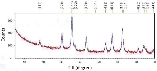 XRD diffractogram of electrosynthesized magnetite nanoparticles. The observed (red) and calculated (blue) patterns are shown.