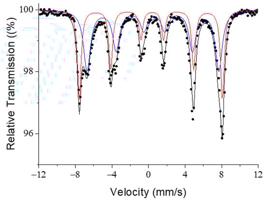 Figure 3 shows the room temperature Mössbauer spectrum for the electrosynthesized Fe3O4 sample. This spectrum is interpreted as the contribution of two sextets with a hyperfine magnetic field of H = 48.5 T (isomer shift, IS = 0.33 mm−1) and H = 44.6 T (IS = 0.52 mm−1), corresponding to Fe3+ located in the tetrahedral position (A) and Fe3+/Fe2+ located in the octahedral position (B) of the spinel structure of (AB2O4), respectively [,]. The hyperfine magnetic fields are slightly lower than those corresponding to the same material in a macroscopic size []. This spectrum corroborates the nanometric character of the particles and the absence of impurities in the sample.