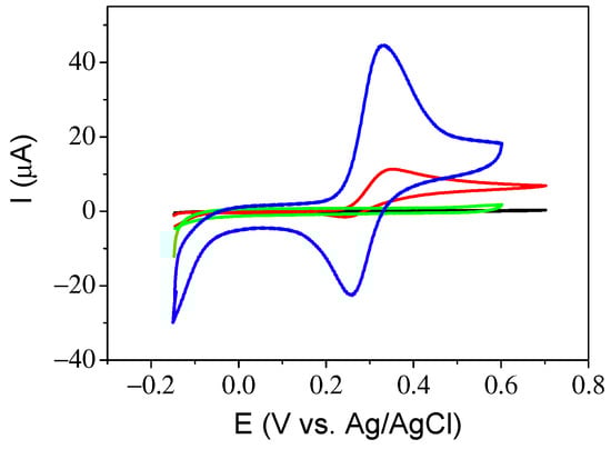 Cyclic voltammogram at GC electrode in 0.1 M PBS (black), GCE/magnetite in 0.1 M PBS (green), GCE in 0.1 M PBS containing 0.5 mM DA (red) and GCE/magnetite in 0.1 M PBS containing 0.5 mM DA (blue); scan rate 50 mV s−1.