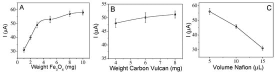 Effect of the amperometric response with (A) amount of the magnetite, (B) amount of carbon Vulcan and (C) volume of NAFION@ 117 in the ink.
