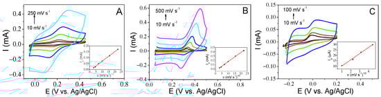 (A) CV curves of PBS 0.1 M with 0.50 mM DA, (B) CV curves of PBS 0.1 M with 0.50 mM UA and (C) CV curves of PBS 0.1 M with 2.00 mM AA at various rates from 10 to 500 mV s−1 (inset: plot of peak current vs. square root of scan rates).
