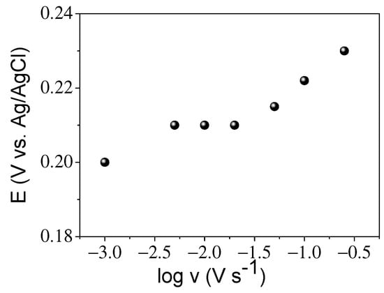 Figure 6A–C displays the voltammetric curves and the inset plots of the current versus v1/2. DA and UA were found to be diffusion-controlled processes and exhibited good linearity in both cases up to a 200 mV s−1 sweep rate. For AA, this linearity is reduced up to a scan rate of 100 mV s−1. The electron transfer coefficient for the anodic processes, αa, can be obtained by the plot of the redox peak potential versus the logarithm of the sweep rate. This calculation has been performed for the dopamine analyte. Figure 7 shows the almost linear behavior of the anodic peak potential (Epa) until 200 mV s−1 in the case of DA. If we use Laviron’s theory, the slope of this plot is equal to 2.3 RT/(αa)nF, where n is the number of electrons transferred, in our case two, T is the temperature and R and F are the conventional values of these constants. The calculated value of αa is approximately 0.4. This value should be 0.5 for a fully reversible process; this difference in value may be due to the process being quasi-reversible. This is also confirmed by the fact that an increase in the sweep rate produces an increase in the peak current as well as an increase in the potential separation of the anodic and cathodic peaks, (Figure 6). If the value of αa is substituted in Laviron’s equation (Equation (1)), the value of the electron transfer rate coefficient is 2.2 s−1. This value is higher than some reported values [,], with a more complicated structure and higher cost. In the case of UA and AA analytes, the process is much more irreversible, and it is not possible to calculate the kinetic parameters through the equations mentioned above.