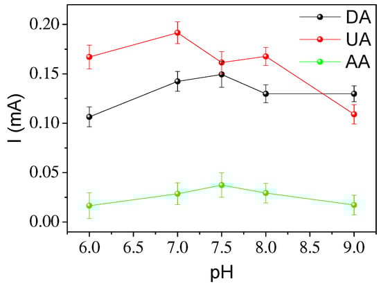 Effect of pH on the peak current at the same concentration of DA, UA and AA as in Figure 6. Scan rate: 50 mV s−1.