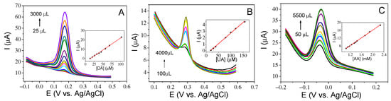 Square wave voltammetry curves of (A) DA from 25 to 3000 µL, corresponding to 10–100 µM, (B) UA from 100 to 4000 µL, corresponding to 20–160 µM and (C) AA from 50 to 5500 µL, corresponding to 1050–2300 µM in a 0.1 M PBS (inset: plot of the Ip vs. the concentration of analyte).