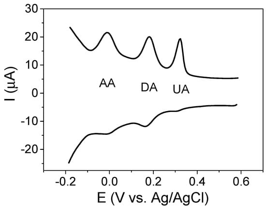 Finally, we evaluated the ability of the sensor to detect the three analytes simultaneously in the solution. Figure 10 shows the square wave voltammetry performed in a solution containing 50 µM DA, 75 µM UA and 2.25 mM AA. As seen, it is possible to quantitatively determine the three analytes, the potentials being sufficiently separated so that there is no interference between them, with potential values of 0.0, 0.195 and 0.32 V vs. Ag/AgCl/KCl(sat.) for AA, DA and UA, respectively.