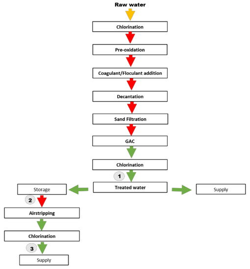 On the one hand, in order to evaluate the formation of THMs and the concentration of T&Os during the treatment of the water in the DWTP and to ensure water quality until supply, one sample per day was collected at the end of the process (sampling point 1 of Figure 1) from October 2020 to December 2021. On the other hand, an analysis of the samples collected before and after the air-stripping process, which was realized when the water was stored for further supply, was carried out from June to December 2021. In this process, water samples were taken from two points, in the inlet of the air-stripping chamber and in the exit of the chlorine stabilization chamber (sample points 2 and 3 of Figure 1, respectively).