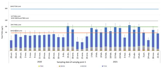 THM concentrations obtained in sample point 1 (Figure 1) treated the water before reaching the supply presented in Figure 4. It can be observed that, during the months of control, no sample exceeded the EU, WHO, and EPA concentration thresholds. For a few samples, the limit established by the EPA (80 µg/L) was included inside the confidence interval and established as the mean value ± standard deviation. The variability of the concentration value of the THMs obtained could be attributed to these data corresponding to an experimental plant in which different process variants and diverse water resources are studied.