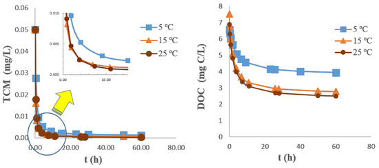 A pseudo-second-order kinetics was obtained for the adsorption of TCM and DOC on GAC with good regression coefficients, noting the enormous differences in the adsorption kinetic constant between both parameters. For example, at a temperature of 15 °C, constant values of 0.112 and 0.136∙10−3 (h∙mg/L)−1 were obtained for DOC and TCM, respectively. In Figure 6, the huge difference in the adsorption rate of DOC over TCM was attenuated because the scale of TCM was considerably larger than that of DOC. Nevertheless, the removal of TCM, including during the DOC adsorption kinetics, was completely achieved despite the 100-fold lower concentrations of TCM in relation to DOC.