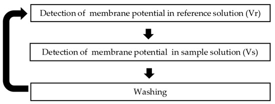 Figure 3 shows the measurement procedure for the taste sensor. Firstly, the detection unit was immersed in a reference solution containing 30 mM KCL and 0.3 mM tartaric acid for 30 s. The membrane potential change between the reference and sensor electrodes was recorded for 30 s. The membrane potential change at the 30th second is used as the sensor output. The potential difference between the reference and sensor electrodes was designated as Vr. Secondly, the detection unit was immersed in a sample solution for 30 s, and the potential difference between the reference and sensor electrode was designated as Vs. The difference between Vs and Vr was considered as the response value. Finally, the membrane surface was refreshed with a water-based cleaning solution of 10 mM KOH, 100 mM KCl, and 30 vol% EtOH. The entire process was performed four times. The mean values and standard deviations (SDs) were calculated from n = 4 (electrode) × 4 (rotation) = 16 electrical response values.