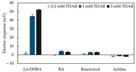 For the modifiers to be adsorbed onto the lipid/polymer membrane, the sensor electrodes were soaked in the modification solution for 72 h. A previous study [30] revealed that the sensitivity of a taste sensor to non-charged bitter substances was improved by soaking the lipid/polymer membrane in a modification solution. As is also shown in another study [38], liquid-membrane electrodes based on charged sites generally show permselectivity for opposite-charge ions, which indicates that TDAB membranes have a strong electrostatic interaction with negatively charged ions. While the Br− from TDAB and the ionized modifiers have negative charges, modifiers such as 2,6-DHBA, BA, 2,6-DHTA, 1,3-DHNA, and 3-Br-2,6-DHBA have very high hydrophobicity, and ionized modifiers can be adsorbed onto the membrane surface through hydrophobic interactions. Thus, ionized aniline with a positive charge and resorcinol without charge can also be adsorbed onto the membrane surface through hydrophobic interactions.