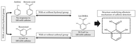 Comparing the structures of 2,6-DHBA and aniline shown in Figure 4, we found that the lipid/polymer membrane modified with aniline cannot effectively bind with caffeine through the H bonds because aniline cannot form H bonds with caffeine via the hydroxyl group, resulting in being nonresponse to caffeine by the taste sensor with this modified membrane. While BA can form H bonds with caffeine via the carboxyl group [39], taste sensors treated with BA cannot respond effectively to caffeine. This is because the H bonds formed by the carboxyl group and caffeine cannot induce a significant change in membrane potential by themselves. Similarly, resorcinol can form H bonds with caffeine, but the caffeine response obtained from resorcinol was insignificant. Thus, these findings revealed that the allosteric mechanism of detecting caffeine involves both carboxyl and hydroxyl groups, where the hydroxyl group can form intermolecular H bonds with caffeine, as shown in Figure 5.