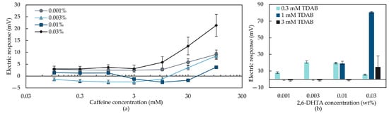 Response to caffeine in sample solutions measured using taste sensors with the membrane modified with 2,6-DHTA: (a) Concentration of caffeine determined using the taste sensors with 0.3 mM TDAB membrane modified with different concentrations of 2,6-DHTA as a function of the response value; (b) electric response to 100 mM caffeine when using lipid/polymer membrane modified with different concentrations of 2,6-DHTA. The error bar indicates the SD of data, n = 4 (electrode) × 4 (rotation) = 16 values.