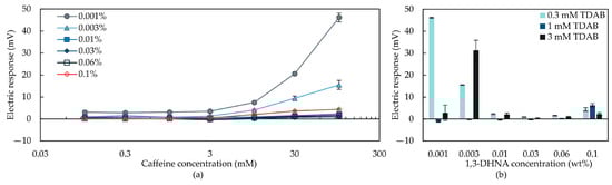 Figure 7a shows the relationship between caffeine concentration and response values determined using the taste sensors with the 0.3 mM TDAB membrane modified with 1,3-DHNA. As shown in Figure 7a, increasing the caffeine concentration resulted in an increase in the electric response to caffeine. This indicates that the taste sensors with the TDAB membrane modified with 1,3-DHNA are sensitive to caffeine. Figure 7b shows the response to 100 mM caffeine measured using taste sensors with the lipid/membrane modified with 1,3-DHNA. The sensor with the 0.3 mM TDAB membrane modified with 0.001 wt% 1,3-DHNA responded to caffeine sensitivity (46.2 mV).