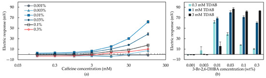 Response to caffeine in sample solutions measured using taste sensors with membrane modified with 3-Br-2,6-DHBA: (a) Concentration of caffeine determined using the taste sensors with 0.3 mM TDAB membrane modified with different concentrations of 3-Br-2,6-DHBA as a function of the response value; (b) electric response to 100 mM caffeine when using the lipid/polymer membrane modified with different concentrations of 3-Br-2,6-DHBA. The error bar indicates the SD of data, n = 4 (electrode) × 4 (rotation) = 16 values.