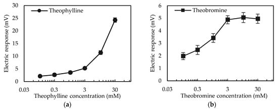 Concentration characteristics of each caffeine analog obtained from taste sensors with the 1 mM TDAB membrane modified with 0.03 wt% 2,6-DHTA: (a) Theophylline; (b) theobromine. The error bar indicates the SD of data, n = 8 (electrode) × 1 (rotation) = 8 values.