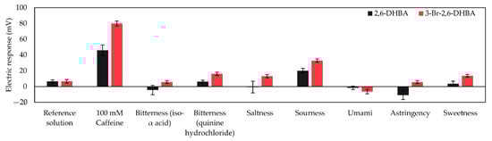 Response to five basic tastes and astringency in sample solutions measured using taste sensors with lipid/polymer membrane modified with 0.03 wt% 2,6-DHBA and 3-Br-2,6-DHBA. The error bar indicates the SD of data, n = 8 (electrode) × 1 (rotation) = 8 values.