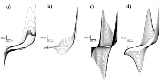 Cyclic voltammograms of PNR on Pt (a) and of the step-by-step preparation of a three-layer electrode system PTh-PANI-PNR composed of PTh on Pt (b); PANI on PTh (c) and PNR on PTh-PANI bilayer (d). (The “+” corresponds to the crossing of the x and y-axis in zero.)