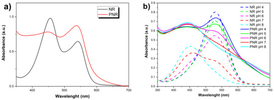 It is obvious from the spectra that, in both forms, deprotonation of the NR phenazine ring occurs with increasing pH of the solution [39,40] (Figure 5).