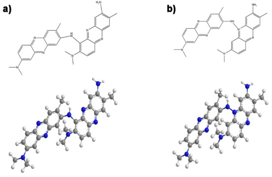 In our previous study, the interconnection of monomer units was hypothesized by interpreting the set of 1H-NMR and Raman spectra [7]. The newly completed study of the UV-vis spectra now leads us to the somewhat modified and detailed conclusion that NR units, next to the NH2 group, are in PNR probably dominantly connected mutually through the free position marked 6 (Figure 6a), rather than through the (positively charged) nitrogen atoms inside the phenazine ring (Figure 6b), as the protonation of the phenazine ring of the polymer is evident.