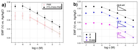 PTh gives a super-Nernst (−53.5 mV decade−1) response to citrate over a relatively narrow concentration range. PANI itself responds to citrates with an almost theoretical slope (−20.4 mV decade−1), but unlike the PNR electrode only in a narrower concentration range. In the bilayer formed by PTh and PNR, the influence of the underlying PTh was partially manifested, as the electrode showed a higher value of the slope than was observed for the simple PNR electrode. If the middle layer was PANI, the parameters of the PNR layer were improved (linear range, detection limit, and accuracy, Figure 7a). When switching the order of the second and third layers, i.e., for the three-layer system formed in the order PTh-PNR-PANI, no significant improvement in the response of PNR to citrates was observed. The detection limits of these multilayer electrodes are comparable to or even better than the detection limit of only PNR on platinum.