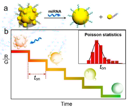 Xu et al. reported real-time quantitative detection of microRNA-21 based on the plasmon ruler [50]. Figure 1 schematically represents the plasmon ruler for microRNA sensing. Smaller AuNPs were bound to larger AuNPs (49 nm diameter) by DNA hybridization to form core-satellite nanoparticles. MicroRNA-21 molecules bind the probe DNA molecule anchored on larger AuNPs, dissociating the core-satellite nanoparticles and inducing a blue-shift in the LSPR spectrum. MicroRNA concentration in the nM range was determined based on the statistical analysis of the distribution of the time range in which one strand displacement event occurs.