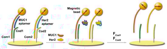 Yao et al. proposed a strategy for the detection of tumor-related proteins based on particle dissociation under applied magnetic field [53]. Figure 2 shows the detection principle. DNA (Com)-modified magnetic microparticles were immobilized on the DNA (Cod)-modified substrate through hybridization. Aptamer DNA bound to the rest sequences of Com. When a magnetic field was applied, the magnetic particles were pulled upward. In the absence of proteins, the magnetic particles remained immobilized on the substrate due to the strong interaction with the substrate. The addition of proteins weakened the binding of the particles with the substrate. The particles dissociated from the substrate when the magnetic force exceeded the binding force between Com and Cod. Thus, proteins can be detected based on the magnetic force required for particle dissociation. Because the strength of the interaction between the magnetic particle and the substrate can be controlled by selecting the DNA sequences of Com, Cod, and aptamer, the magnetic force that causes particle dissociation is optimized for the target protein. Therefore, simultaneous detection of multiple proteins was possible in this system.