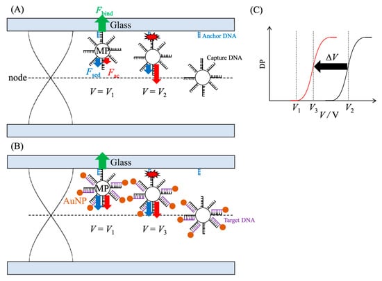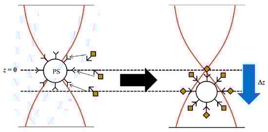 This concept enabled zmol detection of the avidin–biotin reaction (Figure 6) [74,75]. Avidin-modified polymer microparticles reacted with biotin-modified AuNPs. Because the density of AuNPs is much larger than that of the polymer, the binding of AuNPs increased the density of the microparticle and decreased its levitation position. This concept was also extended to the biosensing of nucleic acids [72,73]. Microparticles were bound to AuNPs by sandwich hybridization with target DNA. The interparticle sandwich DNA-hybridization induces an increase in the density of the microparticles. Several thousand DNA molecules were successfully detected. In addition, single polymorphism of the KRAS gene was detected by controlling the length of the complementary probe DNA molecules immobilized on the particles.