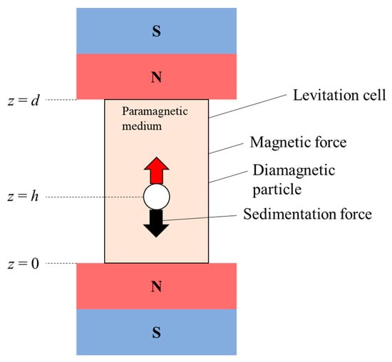 Whiteside et al. proposed a novel technique of particle levitation using a magnetic field, named MagLev [61,62,63,64,65]. Figure 4 shows a representative geometry of MagLev. Diamagnetic microparticles dispersed in the paramagnetic medium are placed between two permanent magnets. In this geometry, magnetic and sedimentation forces act on the particles, and the particles are levitated at the position where these two forces are equal. The levitation height (h) from the bottom of the cell is given by [61,62,63,64,65]