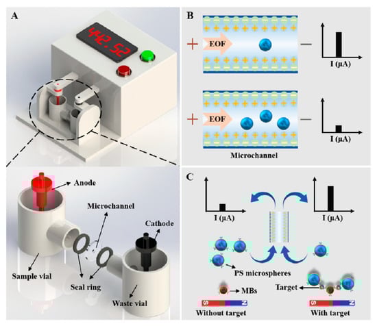 where N is the number of the microparticles in the channel, d is the particle diameter, σ is the electric conductivity of the electrolyte solution, S is the cross-sectional area of the channel, and l is the length of the channel. This equation indicates that R’ depends on d and N. Target molecules mediated the sandwich reaction between the microparticles and magnetic beads, increasing the particle size. This event was detected by an increase in the resistance of the channel. The detection limits of procalcitonin, chlorpyrifos, and L. monocytogenes were 1.58 pg mL−1, 1.16 pg mL−1, and 47.89 cfu mL−1, respectively.