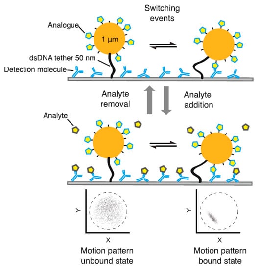 The temporal changes of the motion of the particles tethered to the substrate have also been proposed as a mechanism for biosensing. Prins et al. devised the concept schematically shown in Figure 8 [91,92]. Microparticles functionalized with the target analogue were tethered on the substrate via a double-strand DNA chain with 50 base pairs. The substrate surface was modified with detection molecules. The microparticles bound to the substrate surface by the interaction between the detection molecule and the target analogue. In the presence of the targets, the detection molecules on the substrate surface interacted with the target molecules, dissociating the binding between the microparticle and the substrate. This event was optically detected via the Brownian motion of the microparticles. The binding events of short DNA and creatinine were successfully monitored. Dongen et al. demonstrated a multiplex hairpin-DNA sensor based on the fluctuation in the plasmonic signal intensity [93]. The AuNPs were tethered on the gold film substrate using hairpin DNA that adopts the folded structure in the absence of the target. The plasmonic signal intensity, which depends on the distance between the AuNPs and the gold substrate, varies due to the Brownian motion of the AuNPs. In the folded state of the hairpin DNA, the fluctuation of the signal intensity is small because of the small gap between the AuNPs and the substrate. By contrast, when the target DNA interacted with the hairpin DNA, the gap increased, and the signal fluctuated strongly. In addition, the plasmonic signal fluctuation varied with the length of the unbound sequence in the hairpin DNA. Based on this variation, multiple target DNA molecules with different lengths were successfully detected.