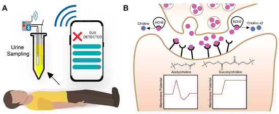 (A) At the scene of an investigation or during an autopsy, a urine sample can be obtained via a catheter or syringe and deposited into a container. The proposed thread-based ISEs can be placed into the urine with a reference electrode and wireless transducer to perform readout to a smartphone. A simple app can be coded to display the positive/negative presence of SUX, the concentration of SUX, and more detailed information about the device calibration and current reading. (B) The biological mechanism of SUX action. The dimer outcompetes acetylcholine for receptor sites and causes prolonged polarization of the neuron, leading to paralysis [].