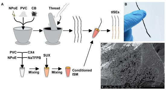(A) The fabrication of the thread-based ISEs. The polymer support (PVC), plasticizer (NPoE), and carbon black (CB) were mixed using a mortar and pestle and deposited onto thread to make the thread-based conductive electrodes. The electrode was then dipped into the sensing cocktail to form the SUX-sensing membrane on the electrodes. (B) shows a fully-fabricated thread-based ISE, and (C) shows the SEM image of the cross-section of thread-based ISE. The smooth membrane coats the microscopic fibers.