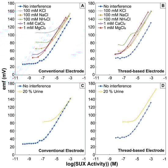The response curves for (A,C) conventional ISEs and (B,D) the thread-based ISEs in the presence of a fixed concentration of interfering cations. (A,B) The interfering inorganic salts caused LODs to increase in both conventional ISE and thread-based ISE systems. (C,D) Unknown urine content caused larger increases in LOD in both systems.
