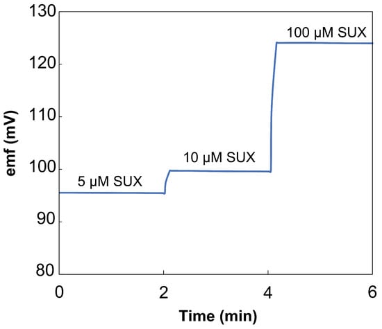 Electrodes were connected to an EMF 16 potentiostat and data were collected with the EMFSuite software. A double-junction Ag/AgCl/Cl reference electrode with 3 M KCl bridge electrolyte was used as a reference electrode []. We performed drift analysis by immersing fresh sensors into 1 mM SUXCl solution for 30 min and recording (electromotive force). Drift is calculated as per minute.