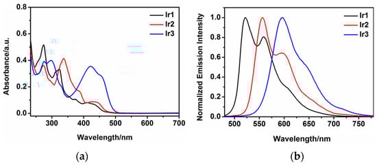 The UV-Vis absorption spectra (a) and normalized emission spectra (b) of Ir1 (black), Ir2 (red), and Ir3 (blue) at room temperature (10 μM in CH2Cl2).